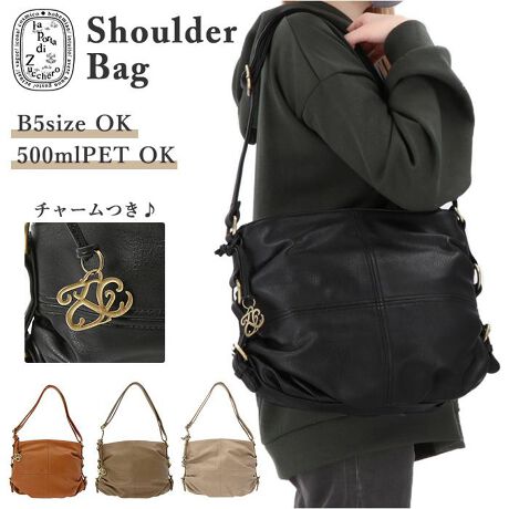 「laporta di zucchero」から、B5サイズの雑誌が入るショルダーバッグが新登場!柔らかで手触りの良い合皮素材を使用し本革のような質感♪大人の女性が持てるデザインを意識してつくられたこだわりのあるバッグ。メインルームはマチが広くB5サイズや500mlペットボトルが余裕で入る大きさ!さらに小物の整理に便利なオープンポケット×2とファスナーポケット付き。ショルダーベルトの長さを調節することで肩掛けだけでなく斜め掛けもできる◎バッグ本体のカラーとゴールド金具に合わせたバッグチャーム付き。