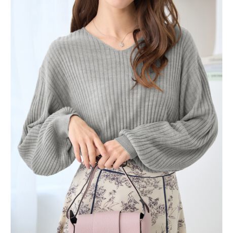 ・ほの甘パフ袖のゆるニットをVネックデザインですっきりとした着こなしに。