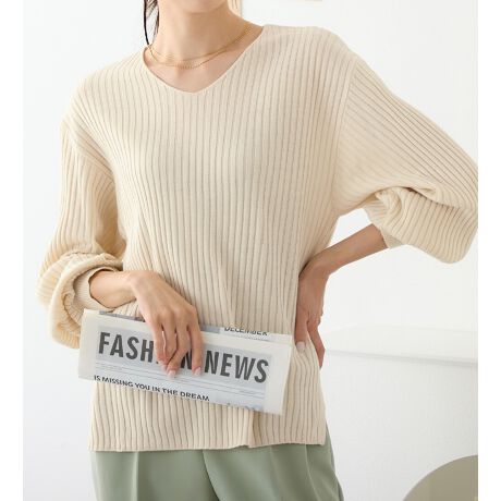 ・ほの甘パフ袖のゆるニットをVネックデザインですっきりとした着こなしに。