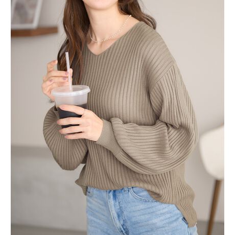 ・ほの甘パフ袖のゆるニットをVネックデザインですっきりとした着こなしに。