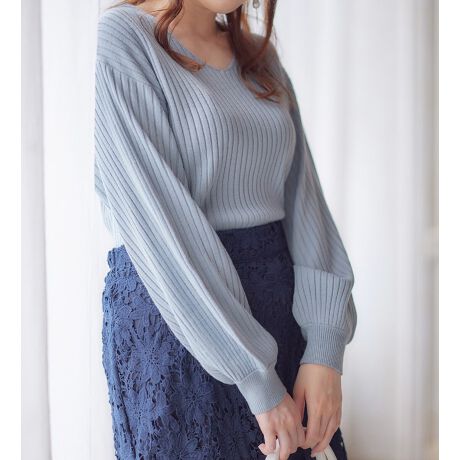 ・ほの甘パフ袖のゆるニットをVネックデザインですっきりとした着こなしに。