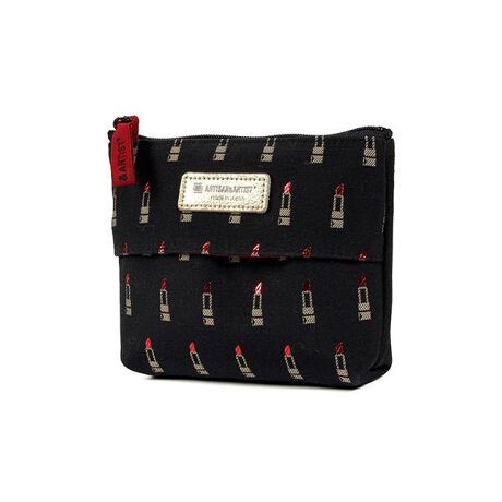 ブラックカラーに、メタリックなラメ糸で織られた真紅のリップスティックとゴールドカラーのパイピングがきらめく人気(*)シリーズから生まれた、ティッシュケース付きポーチです。バッグにすっきり収まりやすいコンパクトなタテ型。コスメ以外にも、衛生用品やカードなど細かな日用品をまとめて収納するのにおすすめです。(*)「アルティザン・アンド・アーティスト」においての人気シリーズということ※写真はイメージです。実際はポーチのみの販売となります。<商品詳細>・素材:[表]ポリエステル、コットン、ラメ [裏]ナイロン・サイズ:120×H90×D20mm・原産国:日本・カラー:BLK(ブラック)