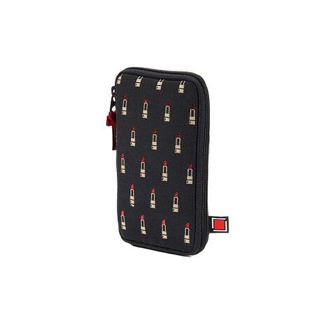 ブラックカラーに、メタリックなラメ糸で織られた真紅のリップスティックとゴールドカラーのパイピングがきらめく人気(*)シリーズから生まれた、大きめサイズのジュエリーポーチです。ファスナーを開けると見開きになり、左側・中央・右側に収納スペースが分かれているつくり。さまざまなサイズのメッシュポケットや、リングやピアスなど多彩なアクセサリーに適したホルダーがあります。中央右面は柔らかなスエード調の生地で、右側に入れたアクセサリーを保護します。(*)「アルティザン・アンド・アーティスト」においての人気シリーズということ※写真はイメージです。実際はポーチのみの販売となります。<商品詳細>・素材:[表]ポリエステル、コットン、ラメ [裏]ポリエステル、ナイロン・サイズ:W80×H145×D20mm・原産国:日本・カラー:BLK(ブラック)