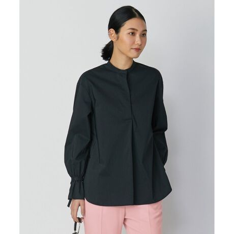 ■デザインゆったりとしたシルエットの一枚で様になるプルオーバーブラウスです。バンドカラーの襟元やDカンベルト付きのボリュームスリーブがポイントのデザインです。抜け感のあるシルエットとエフォートレスな素材感で、旬のスタイリングにピッタリです。単品はもちろん同シリーズのパンツとのセットアップ着用もおすすめです。