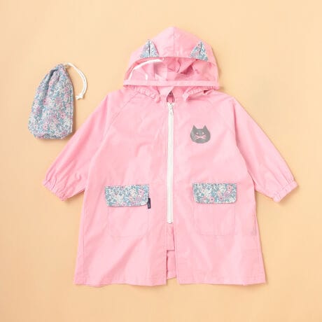 収納袋をセットにしたネコ耳つきのレインコートです。可愛らしい胸モチーフと後ろにはリフレクタープリントをほどこし、暗い道での安全性にフォーカス。つけ外し可能なフードの一部は透明素材で切り替えて、歩行時の視界を確保しました。水をはじきやすくする撥水加工がされており、雨の日に大事なお洋服が濡れるのを回避。後ろ身頃にたっぷりプリーツがあるのでリュックを背負ったまま着用可能です。内側にお名前ネームつき。【透け感】透けない【生地の厚さ】普通【伸縮性】なし【裏地】なし【ポケット】あり