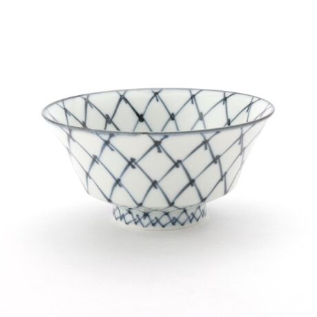 黒色に近い深い藍の呉須色(ごすいろ)を用いたかけ網文様は、古くは一網打尽や大漁へのゲン担ぎで武士や魚河岸に好まれた文様です。