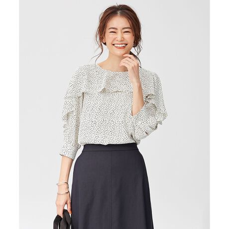 袖から襟ぐりまで、フレアのデザインを施した華やかなブラウス。袖の長さを5分丈にしているので、すっきりと着て頂けます。丈を少し長くしスリットを入れているので、インでもアウトでも着こなしを楽しんでいただけます。ドット柄のサイズもランダムなため甘くなり過ぎずに着ていただけるアイテム。ジャケットのインナーや、一枚着としても使える、大人の女性のための万能ブラウスです。カラーは明るいベースが柔らかなオフホワイト地×ブラックドット(#502)、シックで上品な印象のネイビー地×ホワイトドット(#575)の2色展開です。