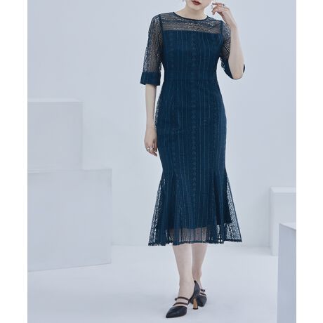 縦のシルエットを強調したパネルレース×梯子レース、裾で広がるマーメイドライン、