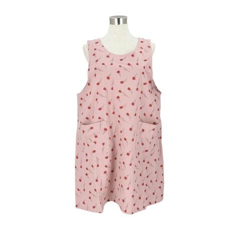 【チュニック】…袖口が大きく開いたノースリーブデザイン。フロントには2つの大きめポケットを配置。首の後ろについたボタンを留めるだけの簡単仕様。