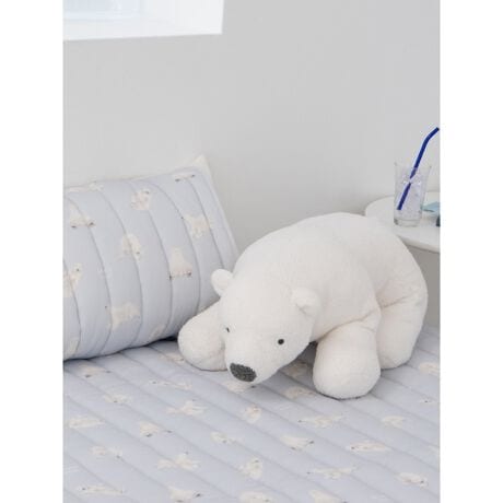 シロクマ柄寝具シリーズとリンクさせて使える、シロクマの抱き枕です。ちょっぴり毛足の短いジェラートを使うことで、夏の抱き枕としてちょうどいいふわふわ感に仕上げました。ちょこんと座ったポーズをしていますが、くたっと柔らかい素材なので寝転ばせることもできます。同じシロクマシリーズのヘアキャップや寝具と合わせてお楽しみください。