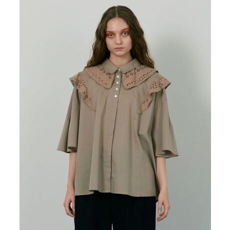 サラッとした肌触りと軽さが特徴のローン生地にザックリとしたクラフト感があふれる刺しゅうが入った素材を組み合わせたデザインブラウス。スッキリとしながらも裾に向かってゆるやかなテーパードがふんわりとした印象をつくり、袖山には繊細なタックを取る事で表情をつくっています。刺しゅうの生地が重なった様に組み合わさっているので程よい立体感が生まれ動きが出ている点もポイントです。華やかな印象がありながらも甘過ぎず、大人な雰囲気に仕上がっているのでコーディネートがしやすいアイテムです。