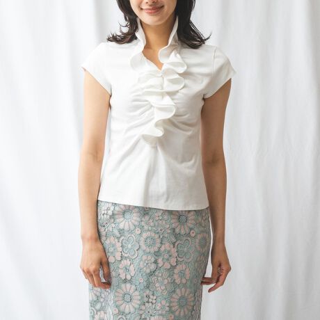 ソフトな風合いのスムースカットソーで仕立てた上品ブラウス。ボディを程よいフィット感に変更し、誰でも着やすいシルエットにしました。フリル端のグログランテープを細くすることで軽い仕上がりになっています。ジャケットのインに重ねたときにも、胸元を華やかに見せてくれます。プライベートからビジネスシーンにと、幅広く活躍してくれるワードローブの頼れる味方です。\n\n・透け感なし\n・ストレッチあり\n・カラー展開はホワイト、ブラック、イエロー、ネイビー\n・サイズ展開は0(S)7号・1(M)9号・2(L)11号・3(2L)13号・4(3L)15号