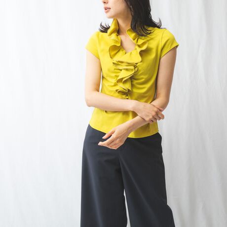 ソフトな風合いのスムースカットソーで仕立てた上品ブラウス。ボディを程よいフィット感に変更し、誰でも着やすいシルエットにしました。フリル端のグログランテープを細くすることで軽い仕上がりになっています。ジャケットのインに重ねたときにも、胸元を華やかに見せてくれます。プライベートからビジネスシーンにと、幅広く活躍してくれるワードローブの頼れる味方です。\n\n・透け感なし\n・ストレッチあり\n・カラー展開はホワイト、ブラック、イエロー、ネイビー\n・サイズ展開は0(S)7号・1(M)9号・2(L)11号・3(2L)13号・4(3L)15号