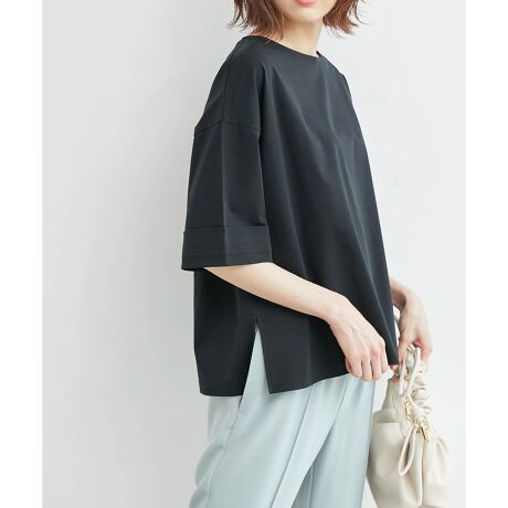 ・シンプルで着回し力の高い、ボートネックの5分袖カットソー。