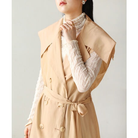動くと空気を含んでエアリーなこのベストはダブルブレストでベルトもついているのでアウター感覚でも着用いただけます。