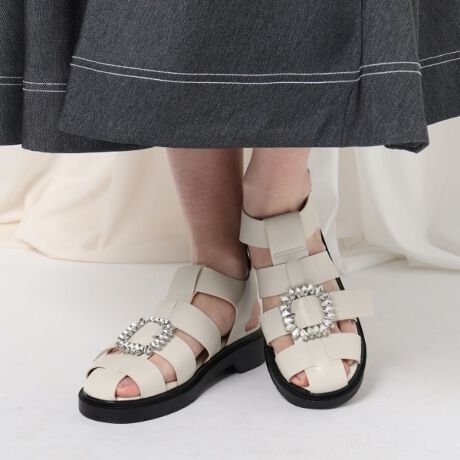 マニッシュな印象のグルカサンダルながら、フロントにビジューをあしらった女性らしいデザインに仕上げました。