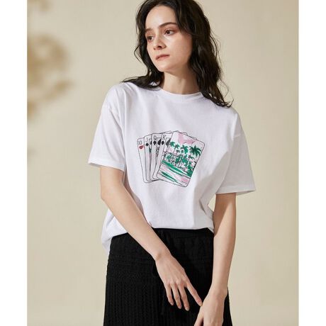 夏らしいヤシの木の絵が描かれたトランプ柄Tシャツ。