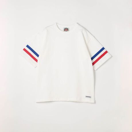 ラグビーシャツの素材を使った袖の配色ラインが特徴の別注Tシャツ