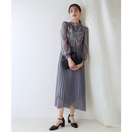 刺繍風レースビスチェ×ボトルネックプリーツドレス