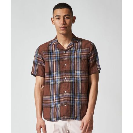 ■デザイン数年前一度だけ展開したシャツテールのオープンカラーシャツです。ややゆとりのあるリラックスフィットなサイズ設定と着羽織りやすいシャツテールが特徴です。開き過ぎない絶妙なバランスの衿デザインも秀逸です。■素材フレンチリネン原料を使用したシャンブレー素材を使用。ネイビーは色糸×色糸の組み合わせで深みのあるカラー表現になっています。またブラウンは、ネイビー×ブラウンの配色が新鮮なビッグチェックです。