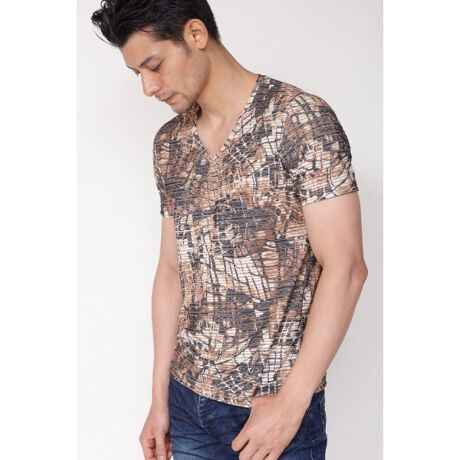 独特の表情感のあるプリント素材を使用した半袖VネックTシャツです。