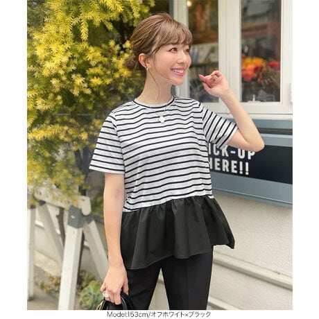 着るだけでスタイルアップ&華やか見えが叶う、異素材MIXのペプラムフレアTシャツです。