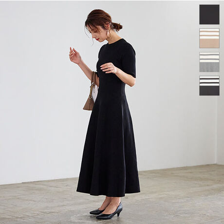 フィット&フレアロングニット5分袖ワンピース