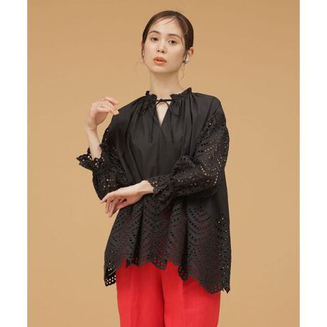 スカラップ模様のカットワーク刺繍を施した春ムード高まるブラウス。ハリのある素材感で衿ぐりのギャザーが際立ち、華やかさがアップ。紐をさらっと垂らして抜け感のあるVネックを強調させたリラクシーな着こなしも今の気分。全面刺繍を入れたボリュームのある立体スリーブが贅沢な甘さを放つフェミニンな1着です。