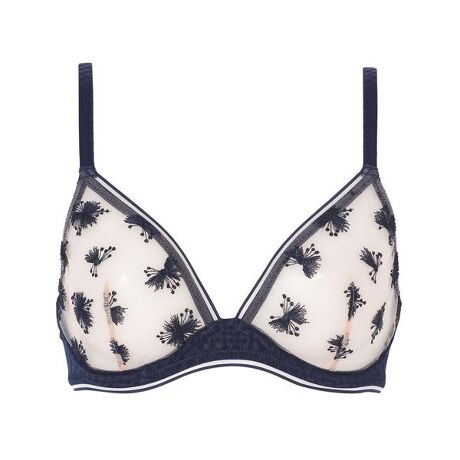 ビンテージな雰囲気のあるサテンジャカード生地と愛らしいエンブレースを組み合わせ、レトロ感とトレンドの両方の魅力を兼ねそなえたトライアングルブラ。カップ部分はレース生地の一枚仕立てで、ライトなつけごこち。※掲載サイズは輸入元サイズです。カップが深めの規格となっておりますので、通常日本製のサイズより1カップ小さいサイズをお選びいただくことをお薦めします。