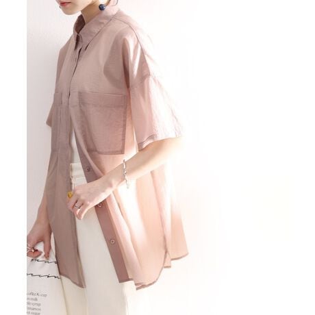 春色カラーのメンズライクシアーシャツ。