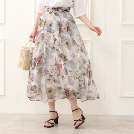 ・セピア調の大花柄を割繊オーガンジーに乗せた夏らしいプリントスカート