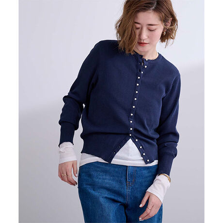 パール釦が女性らしく、上品見えするニットカーディガン。