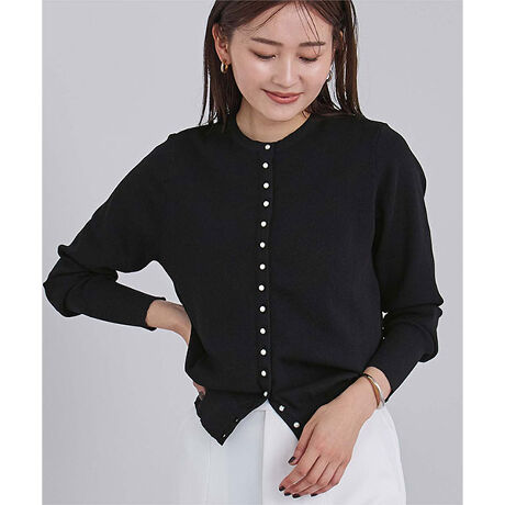 パール釦が女性らしく、上品見えするニットカーディガン。