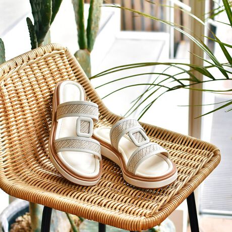 すぐ履けるラフなスライドサンダルと、デザイナー拘りのアッパーデザインの組み合わせが、夏のスタイリングにこなれ感をプラス。