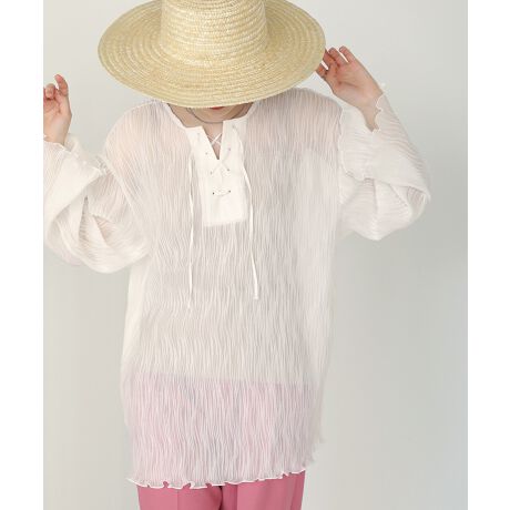 ランダムに折られたシアープリーツ素材の立体感と落ち感が素敵です。縦に波打つように折られたプリーツが、程よい透け感を演出してくれています。スピンドルの部分はポイントになるよう異素材を使用しています。プリーツ素材ですが、お洗濯もしていただくことができるのでホームケアも楽に着用いただけます。