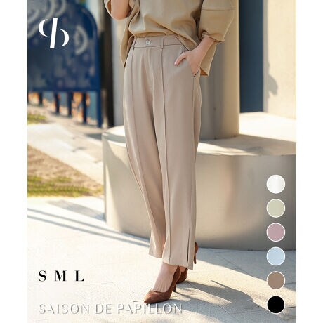 センターのコバステッチできれいめに着こなせるサイドスリット入りフレアパンツ。