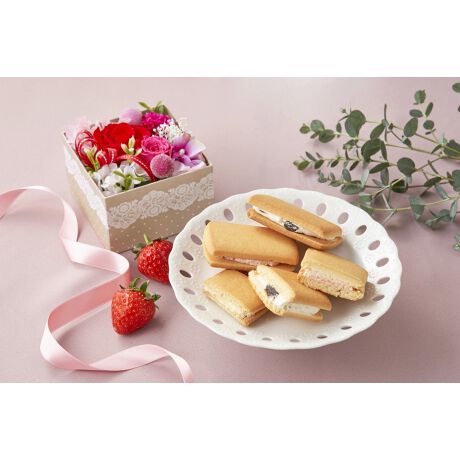 プリザーブドフラワー(バラ×2、カスミ草、アジサイ)、造花、紙製花器、お手入れのしおり、銀座フルーツサンド(マスカットレーズン・いちご・柚子)×各2