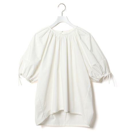 ギャザーラウンドネックとパフスリーブのフェミニンさに、モード感をプラスしたバックオープンブラウス。