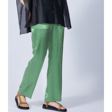 腿回りがすっきりとしたストレートシルエットのサテンパンツ。後ろがゴム仕様ですので、イージーに着用できます。どんなアイテムとも合わせやすいシルエットですので、汎用性の高いアイテムです。