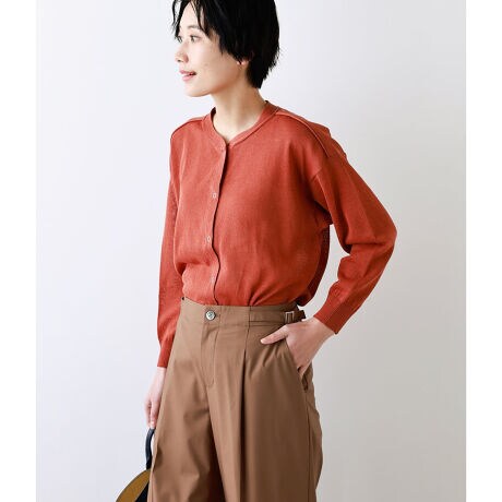 ブルゾン風のデザインが新鮮な長袖カーディガン。肩部分の組織を変え共糸の天竺ロールを挟んだ、ニットならではのディテールをプラスしました。フロントのリングドットボタンもさりげないアクセントに。羽織りとしてはもちろん、ボタンを留めてプルオーバー風の着こなしもお楽しみいただけます。