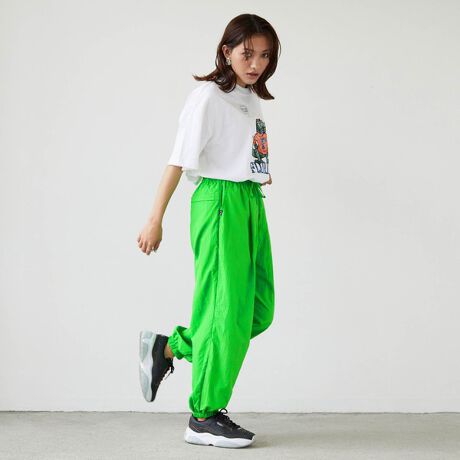 トレンド色の強いナイロン素材のパンツはTシャツをINしても、ダボっとしたトップスを合わせてもこなれ感が出て一気にお洒落に!