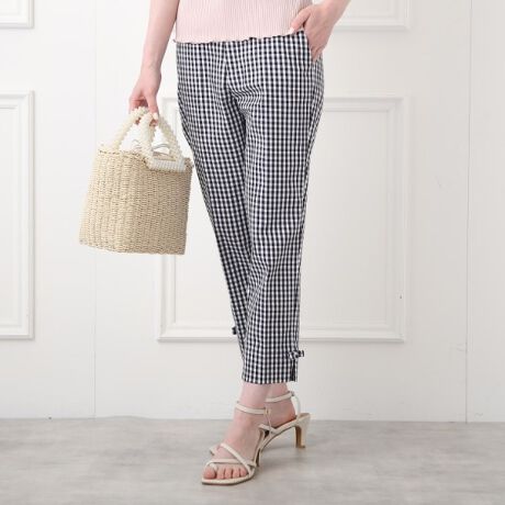 【洗えるストレッチ素材】リボン付きギンガムチェックパンツ