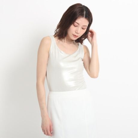 シャイニーな輝きを放つ表情豊かな素材で仕立てたタンクトップ。