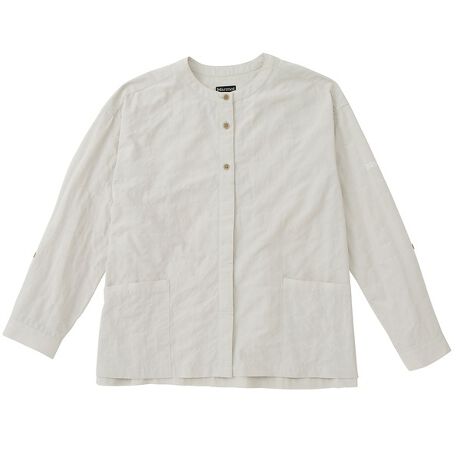 《四角友里コラボレーション》天然素材のような風合いを持ちながらも、ポリエステル100でサラっとした肌触りのアウトドア用シャツです。左右に大きなパッチポケットを配した、ゆったりとしたシルエット。立ち襟のバンドカラーやオフショルダーなど旬を取り入れ、街着のリネンシャツのように軽やかに仕上げています。春夏シーズンにピッタリな白とブルー系の爽やかなカラーリングです。平均重量:175g