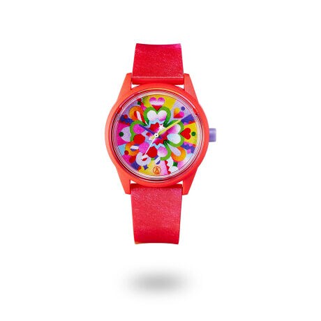 一見左右対称なようで実はアシンメトリーなグラフィックが描かれた文字板は、気分があがるようなカラフルな色彩。