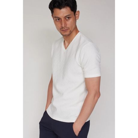 シンプルな型ながら素材の織り成す表情感、ほど良いタイトシルエットできれい目に着こなせる半袖VネックTシャツです。
