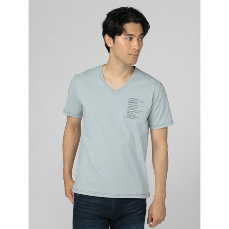 インナーとしてもメインとしても活躍するVネックの半袖Tシャツです。配色ステッチと左胸のメッセージプリントでモードな雰囲気に仕上げています。一枚着としてはもちろん、ジャケットやシャツ、ジレのインナーアイテムにもぴったりです。