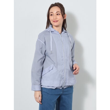 透け感のあるエアリーな素材で、軽やかさが春らしいシフォンナイロンジャケット。ナイロン100%で軽量感があるのはもちろん、速乾性と弾力性に富んでおり、暖かくなる春にぴったりのライトアウターです。フードは取り外し可能でその日の気分に合わせて調整でき、ポケット付きなのでデイリー使いしやすいアイテム。裾部分のドロストで、インナーアイテムやスタイリングに合わせてシルエットを自由に変えられるのもポイントです。春らしい爽やかなブルーに、ベーシックで汎用性の高いネイビー、ライトグレーの3色展開です。