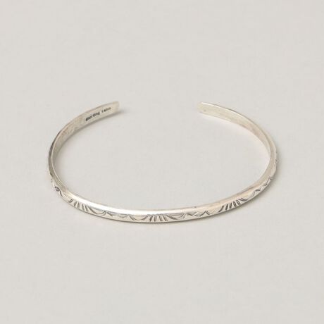 ナバホ族アーティストElaine Tahe(エレイン タヘ)のシルバーバングルです。\n男女問わず、シングル着けでも重ねづけでも使えるハーフラウンドバングル。\n\n18世紀半ば頃にスペイン人の入植者たちによって伝えられたとされるインディアンジュエリー。\nそれぞれの作品には自然界からもたらされる恵みや災害、動植物などに対する敬意が込められています。\n\n素材:シルバー925