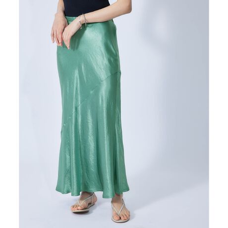 素材をバイアスにとり、身体に沿うようなマーメイドシルエットのスカート。女性らしいエレガントなシルエットですが、後ろゴム仕様とバイアスの伸縮性が快適な着心地を実現。どんなアイテムとも合わせやすいシルエットですので、汎用性の高いアイテムです。サテンの光沢感が上品で、落ち感があるのですっきりと大人の女性がかっこよく履ける一枚です。